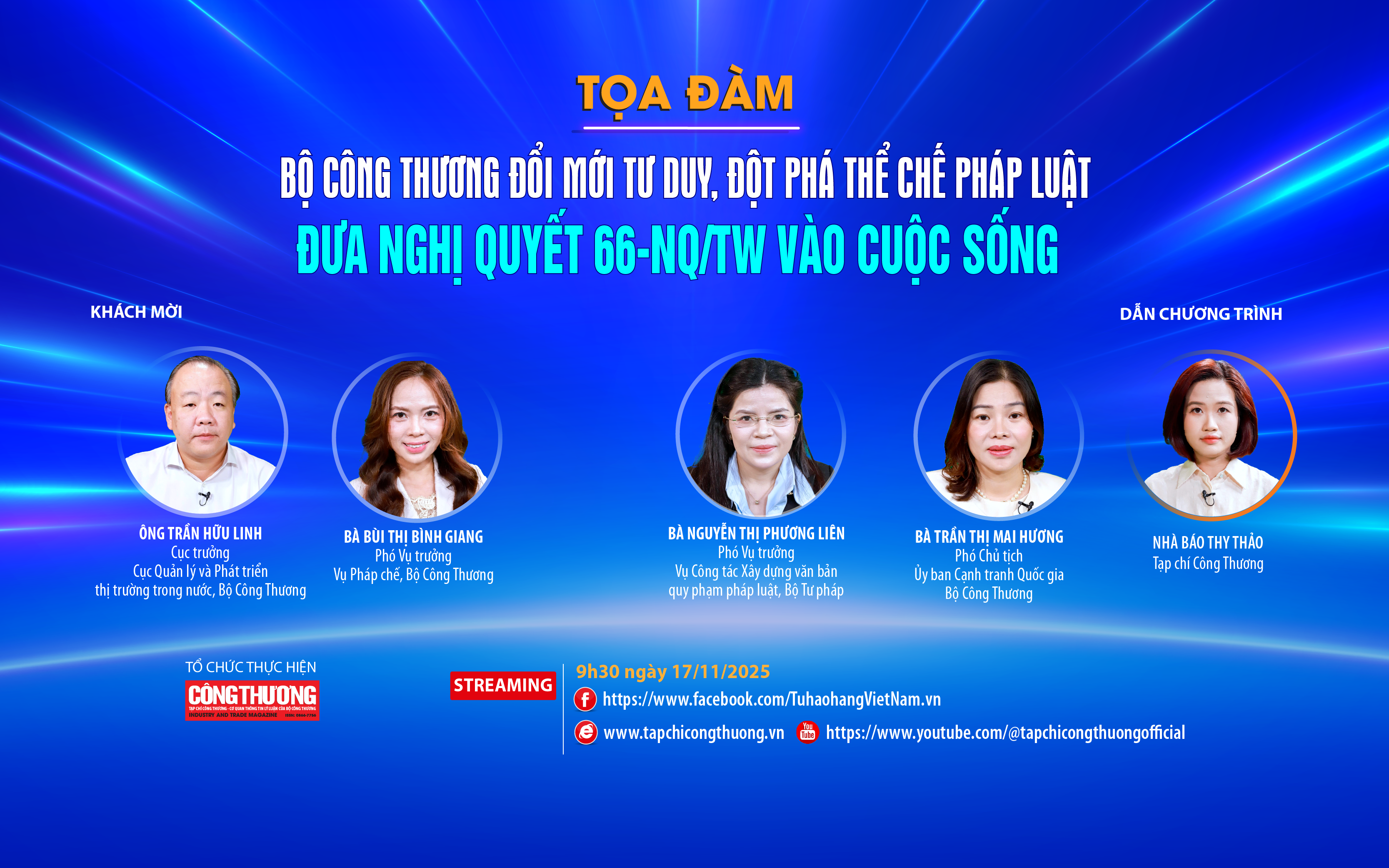 Tọa đàm có sự tham gia của đại diện cơ quan quản lý, chuyên gia nhằm thảo luận về những điểm nổi bật, đột phá trong công tác xây dựng và thi hành pháp luật trong ngành Công Thương thời gian qua; quan điểm, định hướng và giải pháp trong bối cảnh mới, đặc biệt trong việc triển khai Nghị quyết 66-NQ/TW...